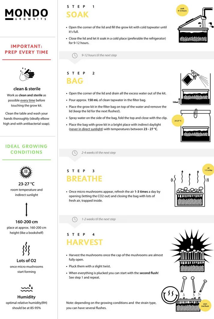 Open kit → Place in grow bag → Light mist → Maintain 22–25°C → Harvest when caps slightly open.